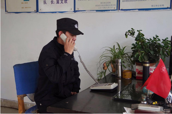 保安隊(duì)員認(rèn)真接聽接警電話