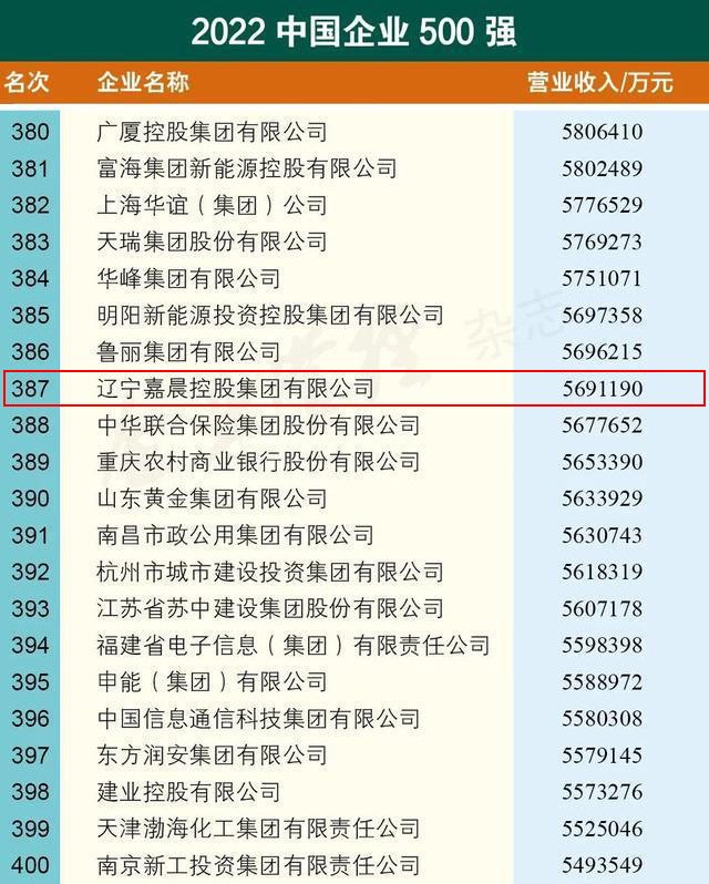 9月6日,中國企業(yè)聯(lián)合會,中國企業(yè)家協(xié)會在京發(fā)布了“2022中國企業(yè)500強”榜單,遼寧嘉晨控股集團榜單排名387位。今年是“中國企業(yè)500強”榜單自發(fā)布以來入圍門檻絕對值提高最多的一年。